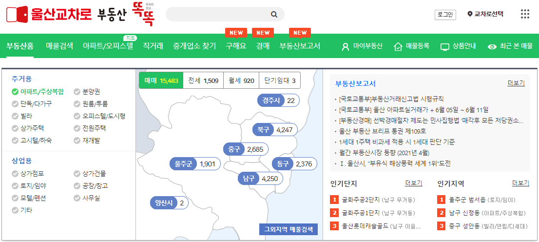 부동산 버튼을 클릭했다면 울산광역시 주거용과 상업용 부동산 매물을 선택해서 찾아볼 수도 있고요. 매매, 전세, 월세, 단기 임대 매물을 검색할 수도 있습니다. 또한 보고서를 보면서 울산 부동산 전망을 확인해 보거나 인기 단지와 인기 지역은 무엇인지 알 수도 있어요.