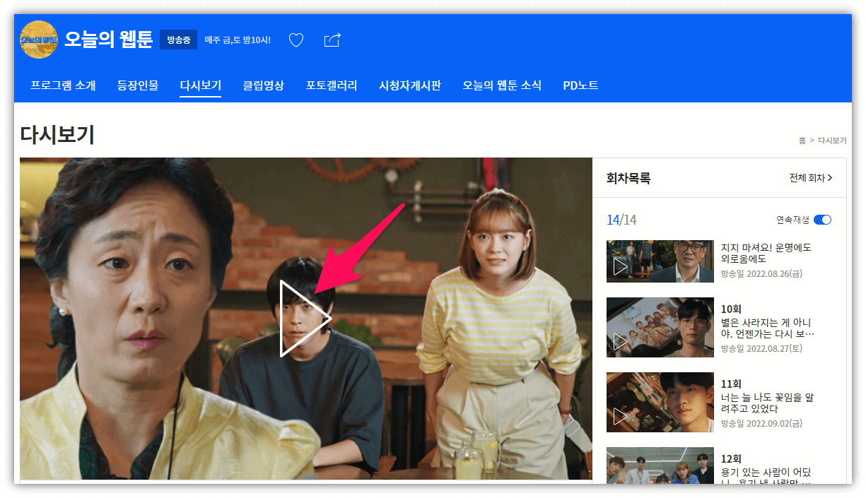 재방송은 시즌(seezn)과 시리즈온 그리고 웨이브(wavve)를 통해서도 보실 수 있습니다. 현재 1회부터 14회까지 올라와 있고요. 조만간 15회와 16회 완결까지 영상이 업로드되어 보고 싶은 회차를 선택해서 오늘의 웹툰 재방송을 보러가기 해서 시청할 수 있습니다.