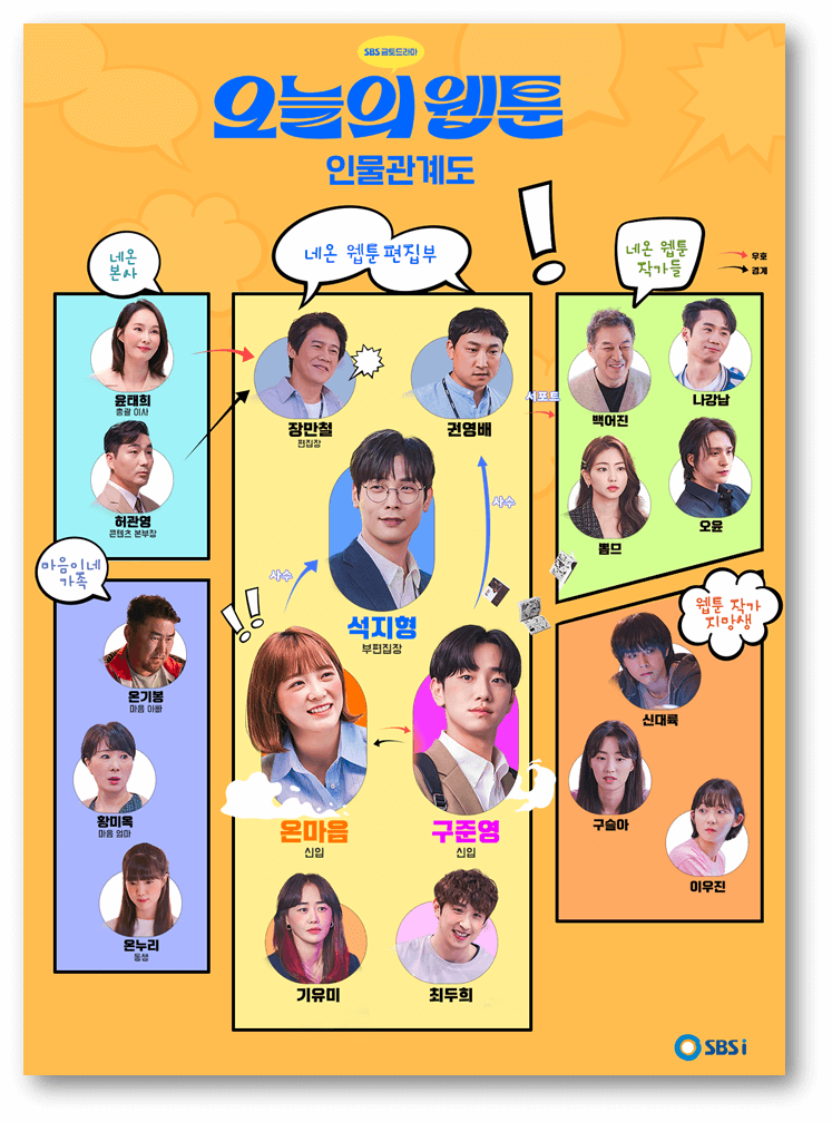 제가 SBS 사이트에 올라와 있는 SBS 금토드라마 오늘의 웹툰 등장인물관계도 사진도 가져왔습니다.