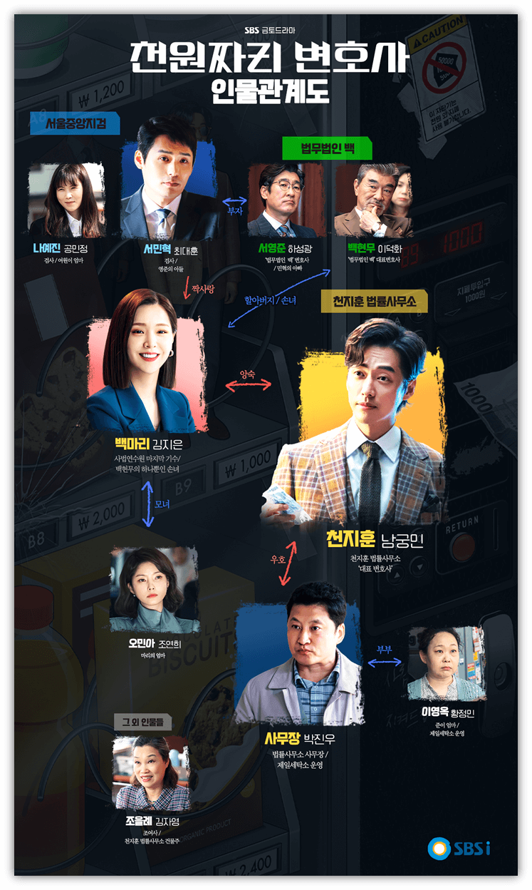 아직 드라마를 못 봐서 어떤 인물이 등장하며 관계는 어떻게 되는지 모르시는 분들도 있을 텐데요. 제가 SBS 사이트에서 가져온 금토드라마 천원짜리 변호사 등장인물관계도 사진도 같이 참고해 보세요.