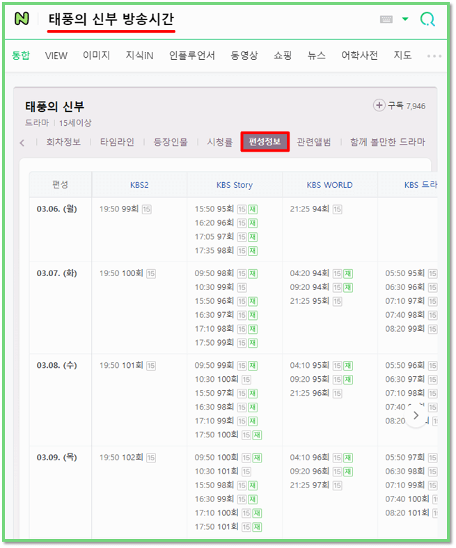 그렇다면 어떻게 재방송을 무료로 볼 수 있는 것인지 궁금하지 않나요? 먼저, 네이버 홈페이지에 접속을 하시고요. 여기서 태풍의 신부 방송 시간을 검색해 보시죠. 그렇게 하면 아래 사진과 동일하게 편성 정보가 나옵니다.