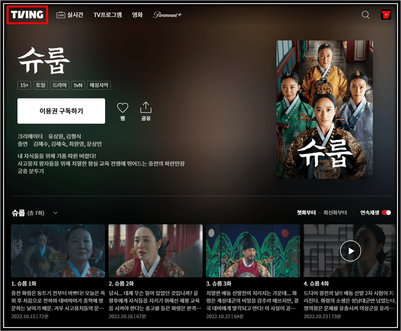 티빙 실시간 tvN 슈룹 시청 방법